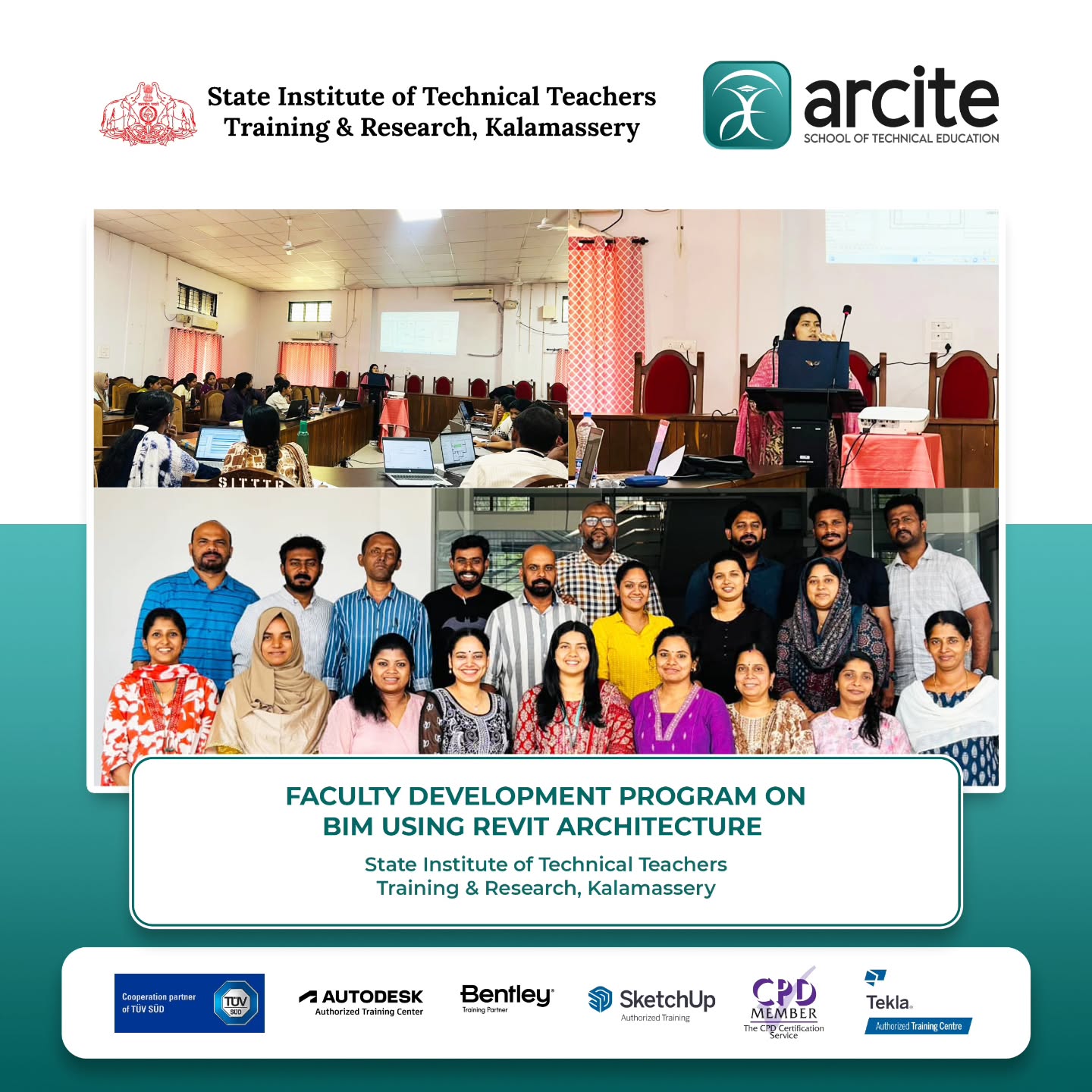 ARCITE School of Technical Education successfully conducted a Faculty Development Program (FDP) on Building Information Modeling (BIM) using Revit Architecture at the prestigious State Institute of Technical Teachers Training & Research in Kalamassery. The program was designed to empower educators with industry-relevant BIM knowledge and practical expertise, enabling them to integrate modern digital construction technologies into engineering and architectural education. During the session, faculty members were introduced to BIM workflows, Revit Architecture tools, and real-time project modelling techniques used in the architecture, engineering, and construction (AEC) industry. The program focused on enhancing teaching methodologies by incorporating industry-driven BIM practices and digital design processes into academic environments. Key Highlights of the Program Hands-on BIM training using Revit Architecture Exposure to industry-standard digital modelling workflows Skill development for engineering and architecture educators Enhancing classroom learning with modern construction technology The Faculty Development Program aimed to transform academic environments into innovation-driven learning spaces by equipping educators with the knowledge and tools required to prepare students for the evolving engineering and construction industry. ARCITE School of Technical Education continues to conduct technical training programs, faculty development initiatives, and industry immersion sessions to support the advancement of engineering education and professional skill development.
