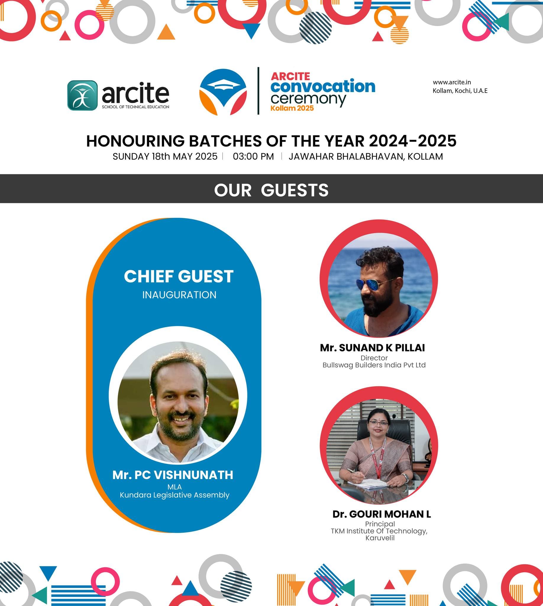 ARCITE proudly announces the Convocation Ceremony 2025 at Kollam, celebrating the academic achievements and successful completion of the 2024–2025 student batches. The ceremony will be held on Sunday, 18th May 2025, at Jawahar Bhalabhavan, Kollam, bringing together students, faculty, industry leaders, and dignitaries. The event will be graced by Mr. P C Vishnunath, MLA – Kundara Legislative Assembly, as the Chief Guest, along with esteemed guests Mr. Sunand K Pillai, Director, Bullswag Builders India Pvt. Ltd., and Dr. Gouri Mohan L, Principal, TKM Institute of Technology, Karuvelil. The ARCITE Convocation Ceremony reflects the institute’s commitment to recognizing excellence, fostering professional growth, and empowering students with industry-relevant skills through globally recognized training programs.
