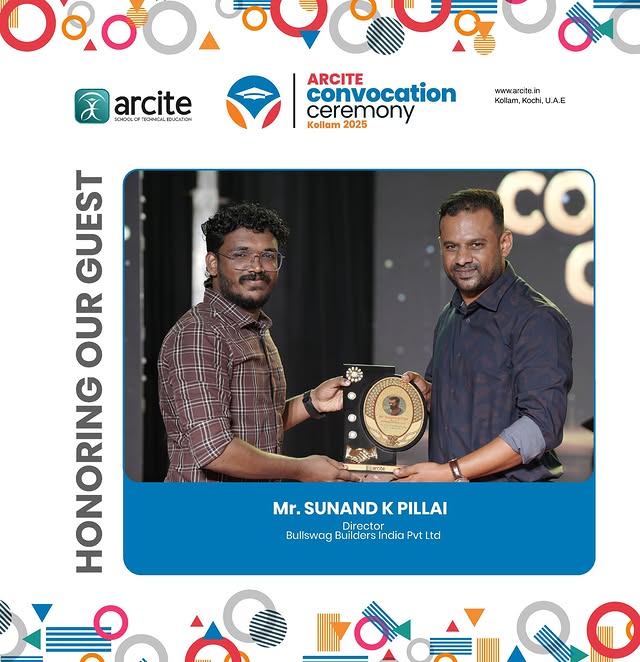 ARCITE proudly celebrated student success at the ARCITE Convocation Ceremony 2025, an event dedicated to recognizing the achievements of graduating students across its campuses. The ceremony was honoured by the presence of Mr. Sunand K Pillai, Director of Bullswag Builders India Pvt. Ltd., who joined as an esteemed guest and inspired students with his industry perspective and encouragement. His presence highlighted the importance of strong industry–academia connections in preparing students for successful professional careers. Events like these reinforce ARCITE’s commitment to delivering industry-relevant skill development and nurturing future-ready engineering and technical professionals.
