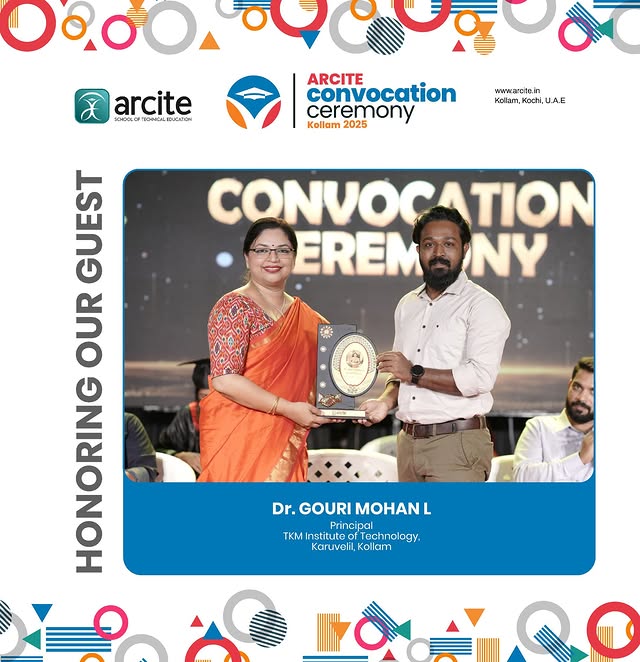 The ARCITE Convocation Ceremony 2025 was enriched by the esteemed presence of Dr. Gouri Mohan L, Principal of TKM Institute of Technology, Karuvelil, Kollam, who joined the event as a distinguished guest. Her inspiring presence and continued support added great value to the ceremony and created a memorable experience for the graduating students. The event reflected ARCITE’s commitment to academic excellence, professional ethics, and strong collaboration with leading educational institutions. Such interactions motivate students to pursue excellence and prepare for successful careers in engineering and technical fields.