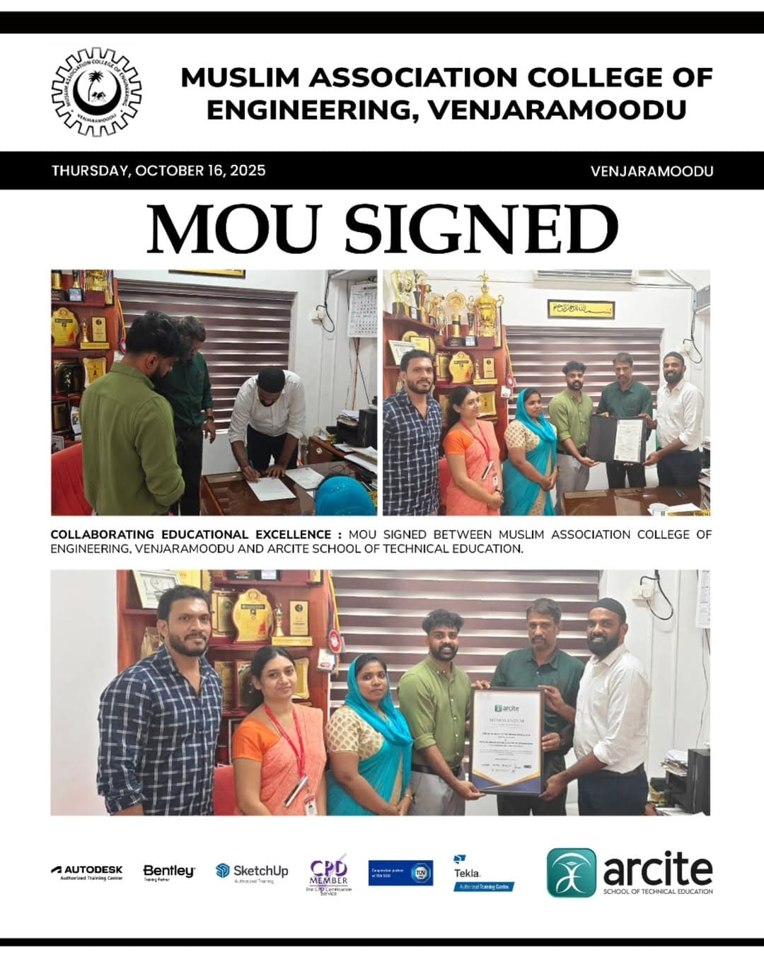 ARCITE Educational Solutions Pvt Ltd has officially signed a Memorandum of Understanding (MOU) with Muslim Association College of Engineering, Venjaramoodu, marking a significant step towards strengthening engineering education and industry-oriented skill development. This collaboration aims to promote a better engineering culture by bridging the gap between academic learning and real-world industry requirements through advanced training programs, workshops, internships, and technology-driven initiatives. ARCITE extends sincere gratitude to Muslim Association College of Engineering, Venjaramoodu for trusting us as a knowledge and training partner in shaping future-ready engineers. As an Autodesk Authorized Training Center, Bentley Institute Product Training Partner, and SketchUp Authorized Training Partner, ARCITE continues its mission to empower engineering students with globally recognized skills and certifications.
